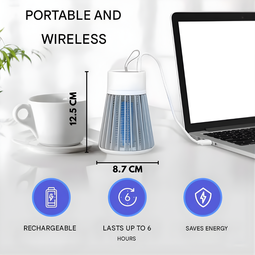 This electric trap is designed to help reduce the presence of mosquitoes and midges in indoor or outdoor areas. It uses light to draw insects toward the device, where a fan directs them into a collection chamber. The enclosed catch area helps keep insects contained until disposal.