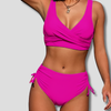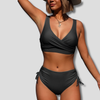 This two-piece swimsuit includes a V-neck criss-cross top with a cropped cut and high-waisted bottoms with adjustable side ties. Ideal to wear on swimming days and beach outings.