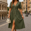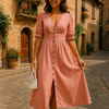 V-Neck Denim Dress with Front Buttons and Tie-Cuff Sleeves
