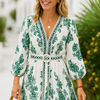Women's Floral Belted Waist Mini Dress with V-Neck and Long Puff Sleeves