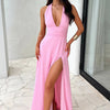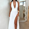 This maxi dress features a halter neckline that ties at the back of the neck, leaving the shoulders and upper back uncovered. The plunging neckline creates a deep front opening that extends toward the waist. A high slit is placed along one side of the skirt and a break in the lower section. The dress falls to full length, offering extended coverage through the hem.