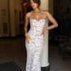 This lace dress features a bodycon that closely follows the contours of the body, with a structured bodice and spaghetti straps. The neckline is scalloped, echoing the floral lace pattern used throughout the garment. A lining beneath the lace offers contrast and full coverage. The long-length hem adds balance to the upper cut.