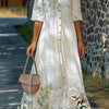 This maxi-length dress has a V-neckline and short sleeves. A button placket runs vertically down the front. The linen fabric features a botanical print. Pleated detailing sits below the bust line. This dress is suited for garden parties or daytime events.