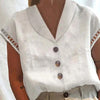 This short-sleeve linen shirt has a V-neck collar and button-front closure. Decorative lace trims the sleeve edges. The lightweight fabric is suited for warm weather. This shirt is appropriate for casual outings or daytime wear.