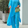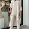 This women’s linen set includes a tunic-style top and wide-leg trousers. The top has a round neckline, three-quarter sleeves, and a hem that is longer at the back. The trousers have a wide-leg cut in the same material. Ideal to wear on casual days.