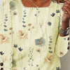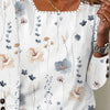 This long-sleeve blouse has a square neckline with a decorative edge. The floral print covers the entire fabric. The sleeves feature buttoned cuffs. The blouse has a standard fit. This blouse is suited for office wear or casual outings.