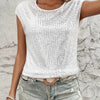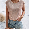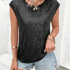 This women's blouse is made for summer and features a round neckline and short sleeves. The surface includes sequin embellishments arranged across the fabric. The material is lightweight and suited for use in warm temperatures.