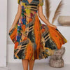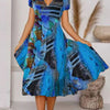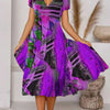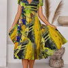 This dress has a V-neckline and short sleeves. The A-line skirt flares gently from the waist. The fabric displays an abstract patterns. The length falls below the knee. This dress is suited for casual or dressy occasions.