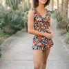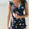 This women's swimsuit romper features a wrap-style V-neck top with ruched sleeves. The built-in bra offers added coverage. The shorts have a wide elastic waistband, decorative ruffle trim at the hem, and functional side pockets. Designed for summer water activities and casual lounging.