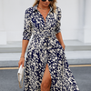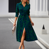 Add elegance to your everyday wardrobe with this printed A-line shirt dress β€” a perfect fusion of vacation ease and commuter style. Crafted from soft, slightly stretchy jersey fabric, this dress features a turn-down collar, short sleeves, and a natural waistline that flows into a flattering A-line silhouette. The front slit adds a modern touch, while the printed design keeps your look fresh and stylish.