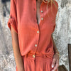 This women's set includes a short-sleeved button-down shirt with a collared neckline and matching shorts. The shorts are made from the same linen material and feature buttons at the waist. Ideal to wear on warm days, casual errands, or relaxed settings.